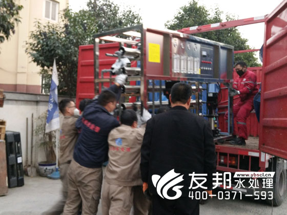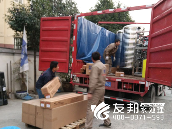 師傅們正在裝車發(fā)貨的是鄭州友邦生產(chǎn)的型號為YB-CJS-002的2噸純凈水設(shè)備。這套設(shè)備是用在鄭州高新區(qū)機(jī)械廠的生產(chǎn)用水。