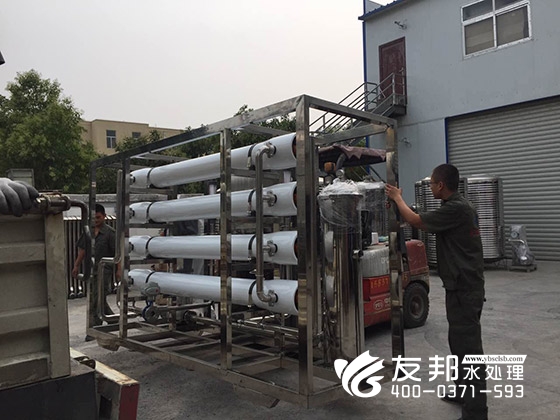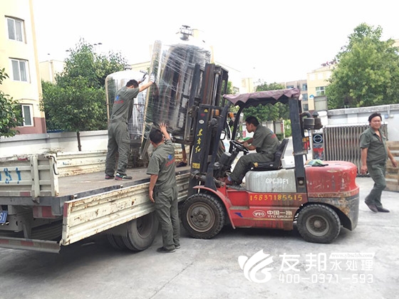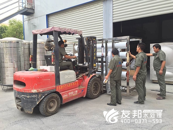 這套型號為YB-CJS-008的水處理設備正在裝車發(fā)貨,是發(fā)往新鄉(xiāng)某新材料有限公司。鄭州友邦在此次合作中為新鄉(xiāng)某新材料有限公司提供提供的8T/H純水系統(tǒng),完美的解決了對方在生產工藝用水方面的需求,成功幫助對方實現(xiàn)了新材料的生產。