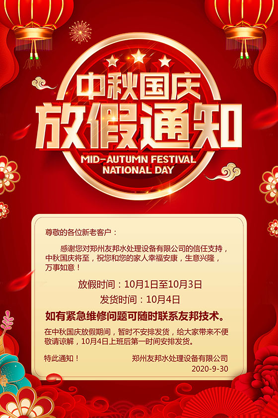 放假時(shí)間:10月1日至10月3日,發(fā)貨時(shí)間:10月4日,如有緊急維修問題可隨時(shí)聯(lián)系友邦技術(shù)。在中秋國(guó)慶放假期間,暫時(shí)不安排發(fā)貨,給大家?guī)聿槐憔凑?qǐng)諒解,10月4日上班后第一時(shí)間安排發(fā)貨。謝謝大家對(duì)友邦的大力支持!聯(lián)系電話:0371-53768300