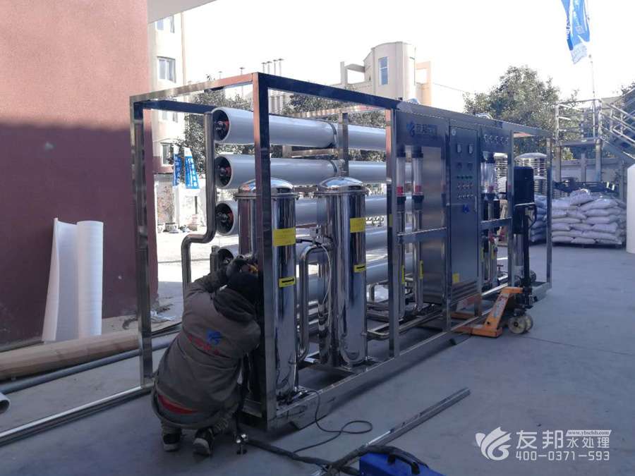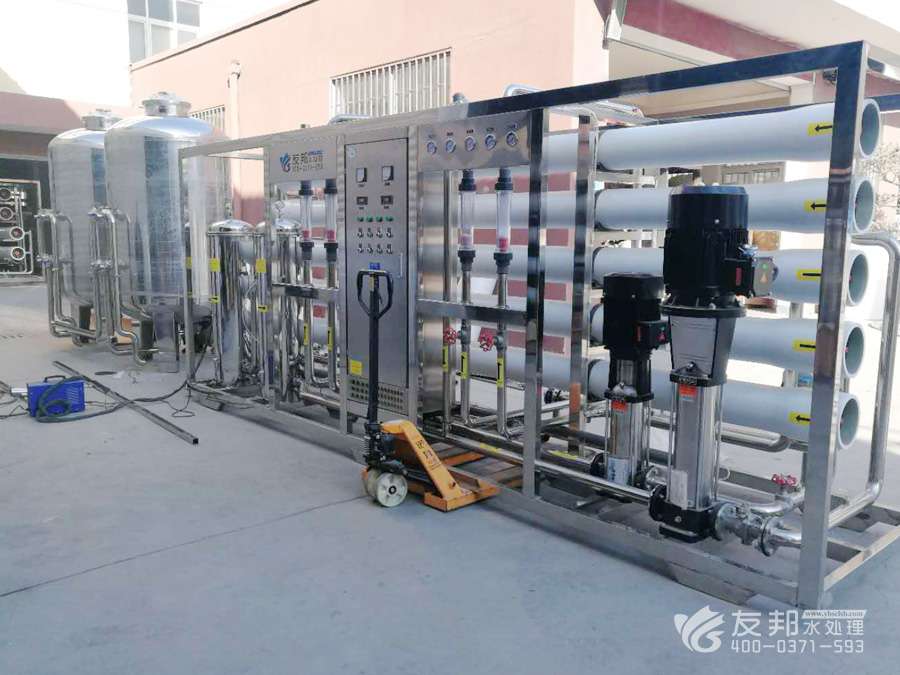 地下水或城市自來(lái)水——原水增壓泵——石英砂過(guò)濾器——活性炭過(guò)濾器——加藥裝置(阻垢劑)——精密過(guò)濾器(10微米)——精密過(guò)濾器(5微米)—— 一級(jí)高壓泵——一級(jí)反滲透過(guò)濾(可達(dá)到脫鹽率98%)——加藥裝置(PH調(diào)節(jié)) ——二級(jí)高壓泵——二級(jí)反滲透過(guò)濾(可達(dá)到脫鹽率99.5%以上)——純水箱