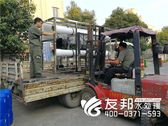 這套型號為YB-CJS-005,每小時出水5噸的單級水處理設(shè)備是發(fā)往新鄉(xiāng)的,工人們冒著炎炎夏日正在裝車發(fā)貨。