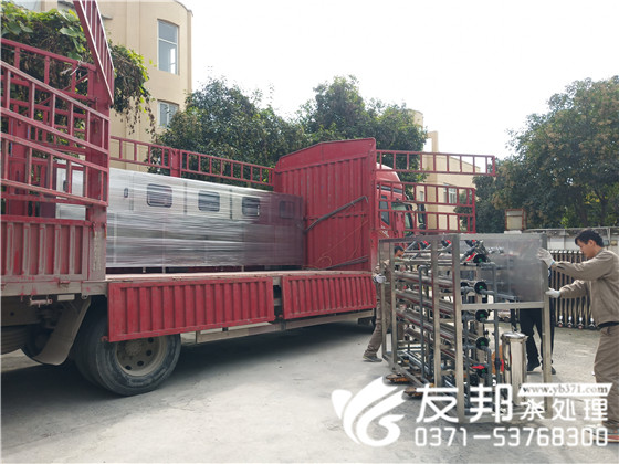 即將裝車發(fā)貨的是一套5噸雙級(jí)純凈水設(shè)備。此套設(shè)備發(fā)往洛陽,采購此套設(shè)備的廠家已經(jīng)和友邦合作多年。廠房擴(kuò)建升級(jí),客戶依然選擇了友邦。鄭州友邦創(chuàng)始于2003年,18年水處理設(shè)備經(jīng)驗(yàn),設(shè)備運(yùn)行成本低,出水穩(wěn)定,不錯(cuò)的選擇。