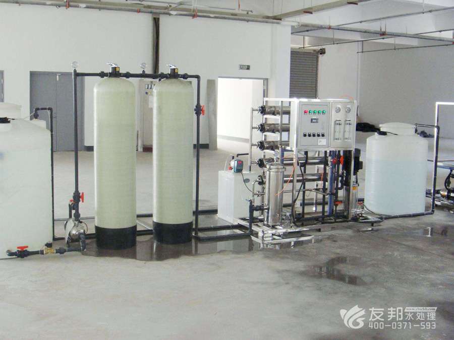 原水→原水加壓泵→多介質(zhì)過濾器→活性炭過濾器→加藥裝置→精密過濾器→第一級反滲透 →PH調(diào)節(jié)→中間水箱→第二級反滲透(反滲透膜表面帶正電荷)→純化水箱→純水泵→陰陽樹脂混床→微孔過濾器→用水點