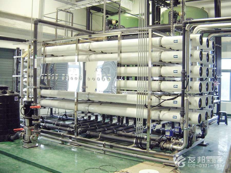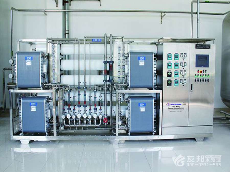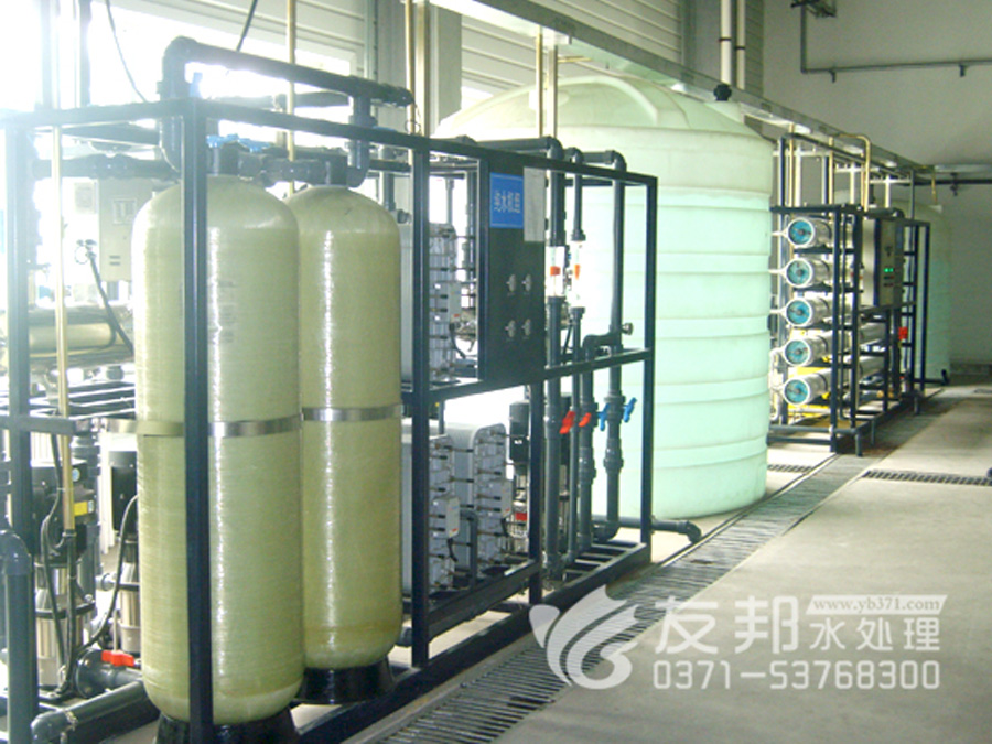2、預(yù)處理→反滲透→中間水箱→水泵→EDI裝置→純化水箱→純水泵→紫外線殺菌器→拋光樹脂→0.2或0.5μm精密過濾器→用水對象(≥18MΩ.CM)(最新工藝)